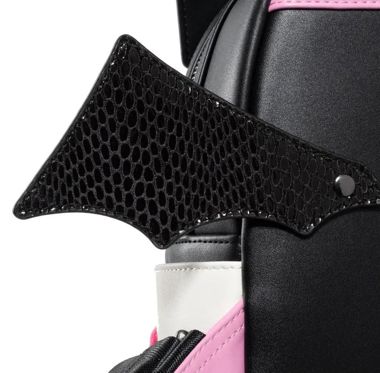 This mini-backpack features Kuromi's signature black and pink color scheme, complete with her jester skull motif front and center as a molded metal charm, along with some faux fur pom-pom details. But the star of the show are her 3D moving wings! This faux leather backpack features a sturdy top handle, adjustable shoulder straps, a front zipped pocket, gunmetal hardware, side drop pockets, 3D wings, an applique, embroidered and printed details with a coordinating interior lining! This mini-backpack measures approximately 11-inches tall x 8-inches wide (13-inches with wings expanded) x 4 1/2.
